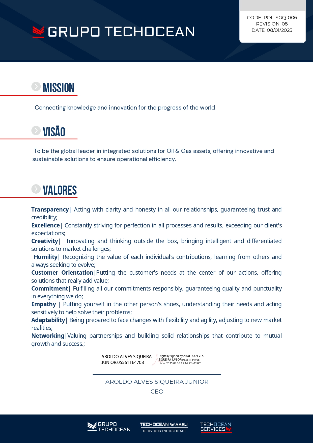 Somente assim podemos construir uma reputação sólida e gerar valor real para todos os envolvidos, demonstrando que nossos valores são parte integral da nossa cultura e operações.