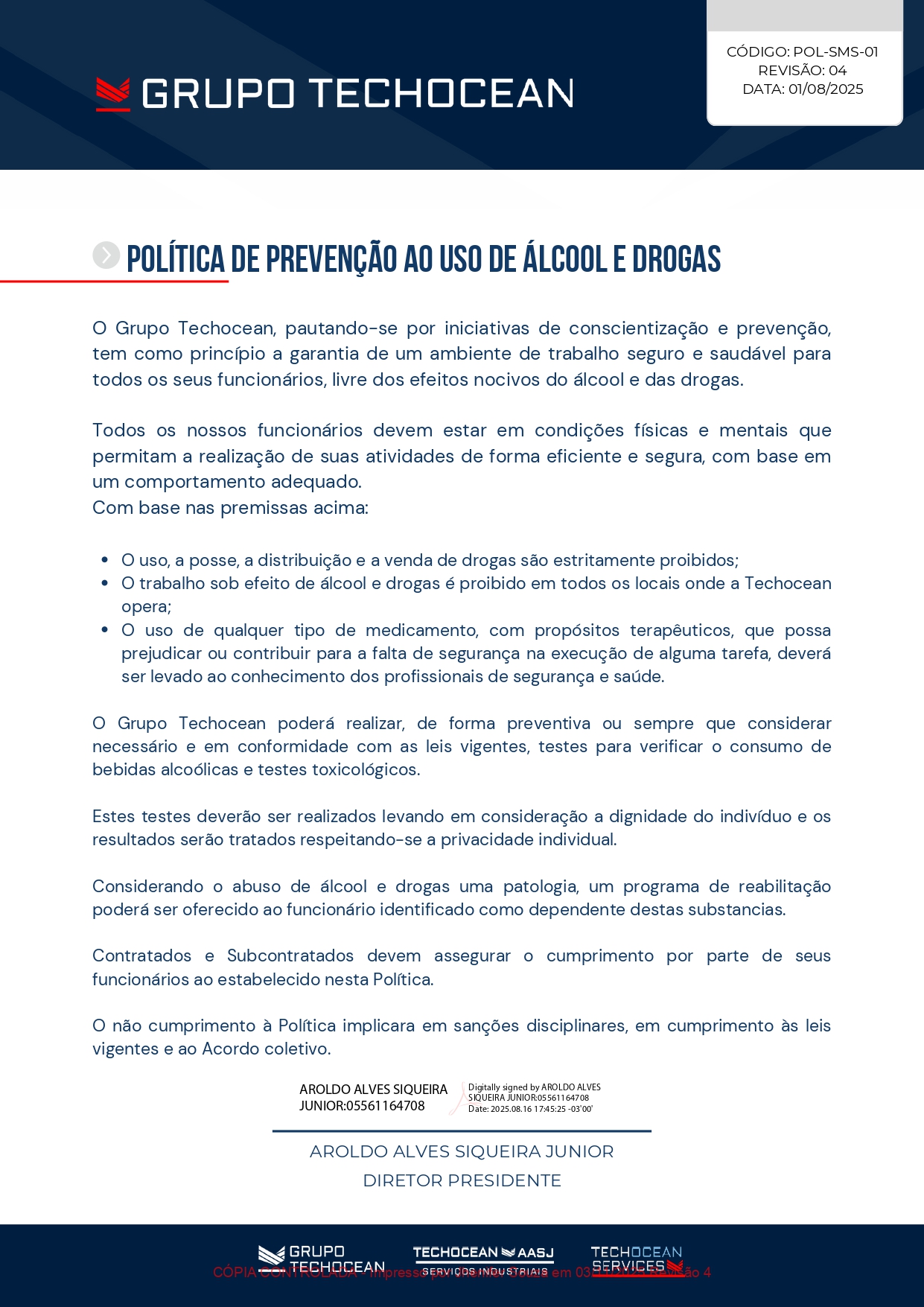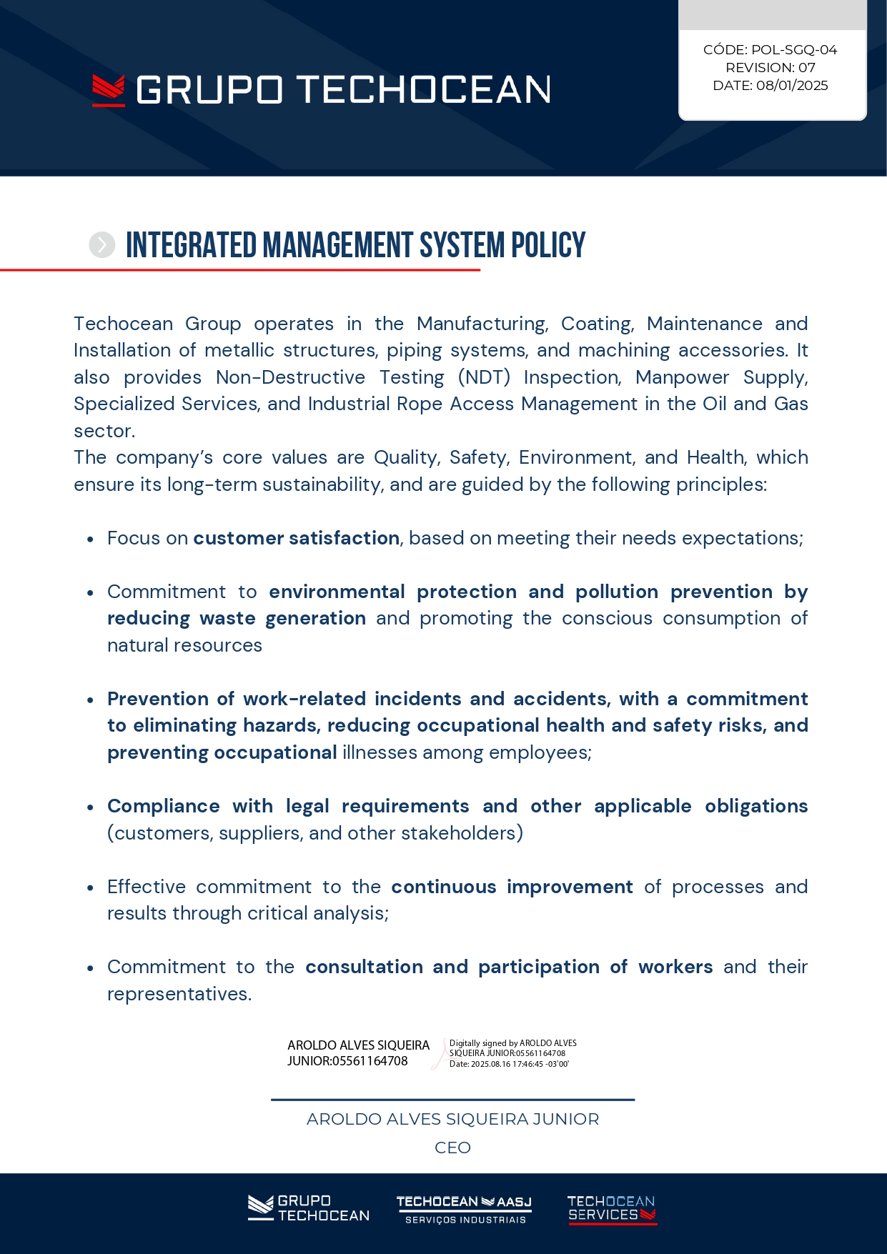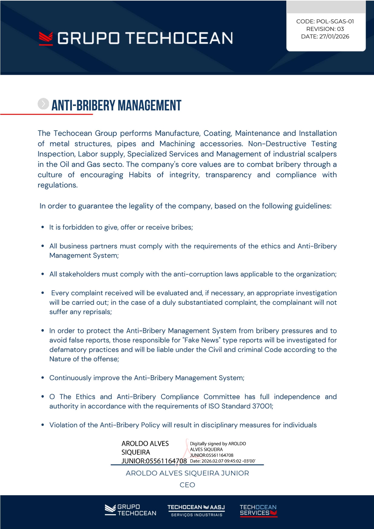 Nosso canal de compliance que possui o objetivo de analisar e combater situações que ferem o código de conduta da empresa; Seus valores a combater o suborno e qualquer tipo de discriminação e descumprimento dos princípios do Código de Ética e Conduta do Grupo Techocean. Todas as informações serão confidencias das informações reportadas. O contato é anônimo.